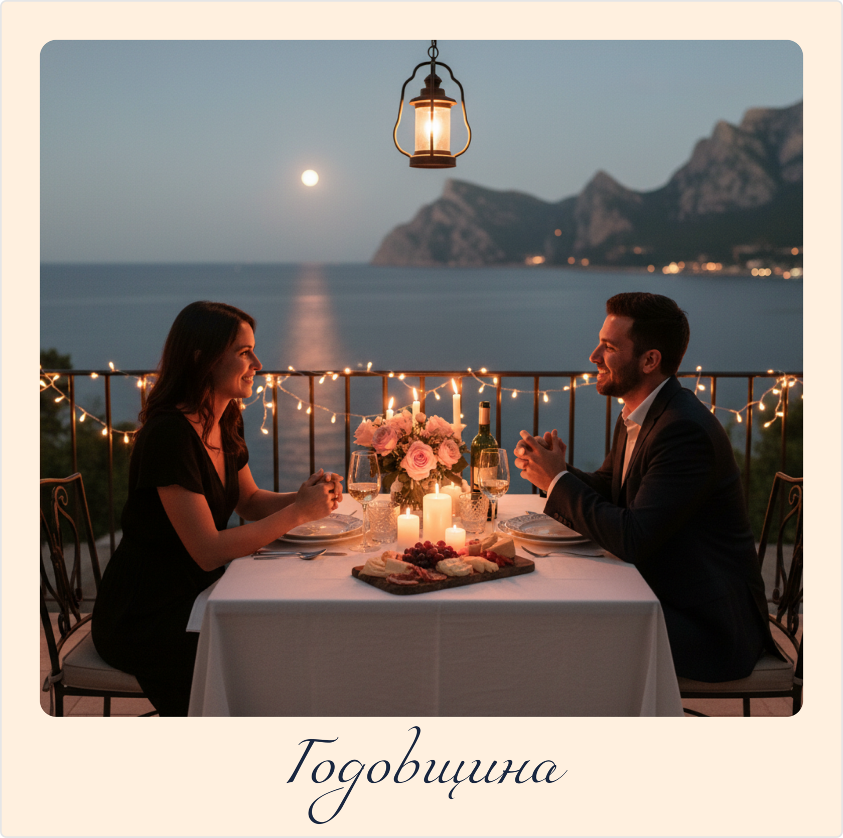 Программа: Ужин на природе, у моря или в живописном месте. Индивидуальное меню, праздничное оформление, свечи. Возможность выбрать музыкальное сопровождение и формат: пикник, сервированный стол, приватный шатёр.